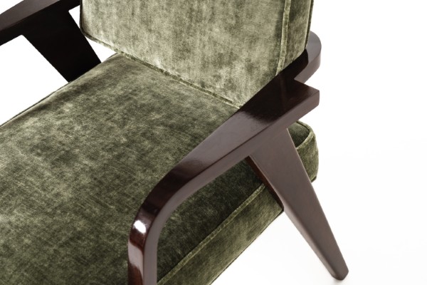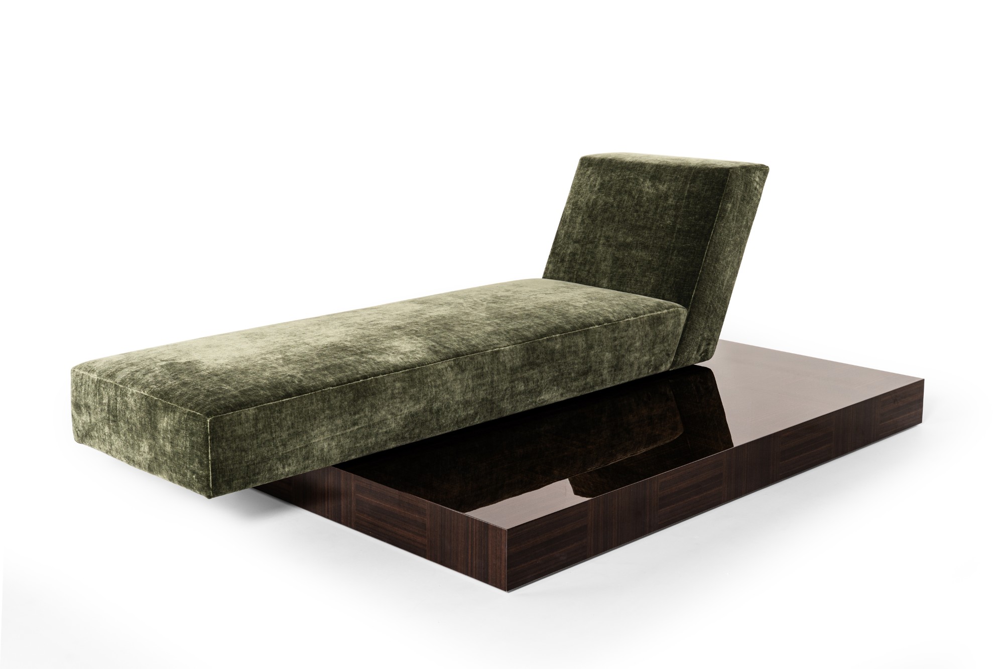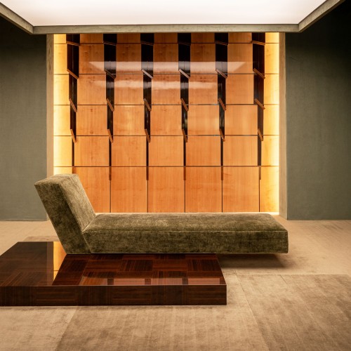 Le aree living, dining, studio e relax si fondono in una scenografia fluida, senza barriere fisiche e aperta al cambiamento. L’allestimento, privo di suddivisioni rigide, si configura come un paesaggio astratto in cui le funzioni si intrecciano senza soluzione di continuità. La luce, filtrata da grandi lucernari, accentua questa fluidità, mentre un gioco cromatico nei toni del verde definisce le zone attraverso una palette di velluti cangianti realizzati ad hoc per la collezione 2025, capaci di modificare la percezione a seconda del punto di vista.