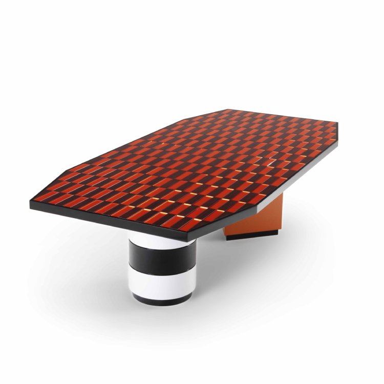Tavolo scultoreo a doppia base, dove geometrie contrastanti e materiali pregiati - dal toulipier laccato al mogano con inserti specchiati - si fondono in una composizione sofisticata e contemporanea dal forte impatto visivo.
