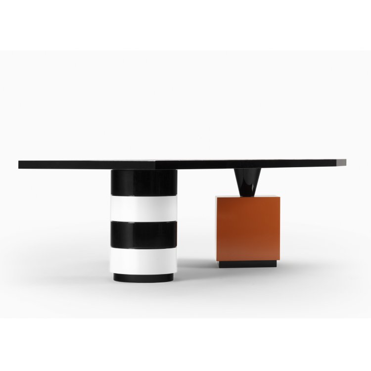 Tavolo dal design scultoreo composto da due basi distinte: una cilindrica in legno massello di toulipier con finitura laccata lucida bianco e nero, e una romboidale in multistrato laccato arancione con supporto conico in legno massello nero.